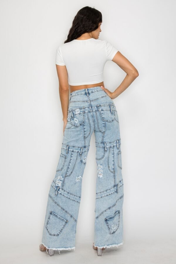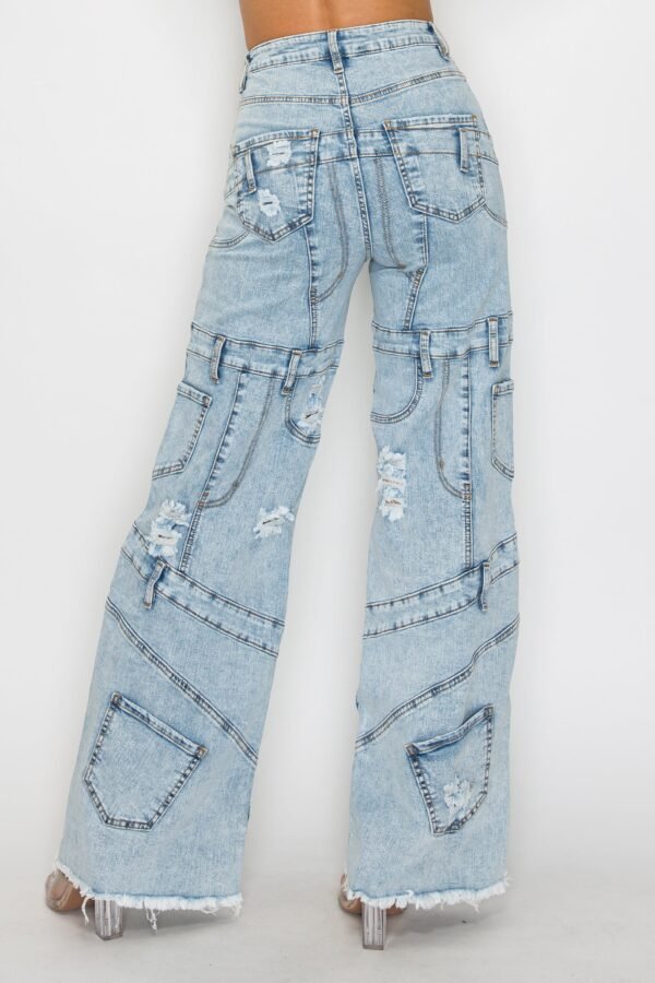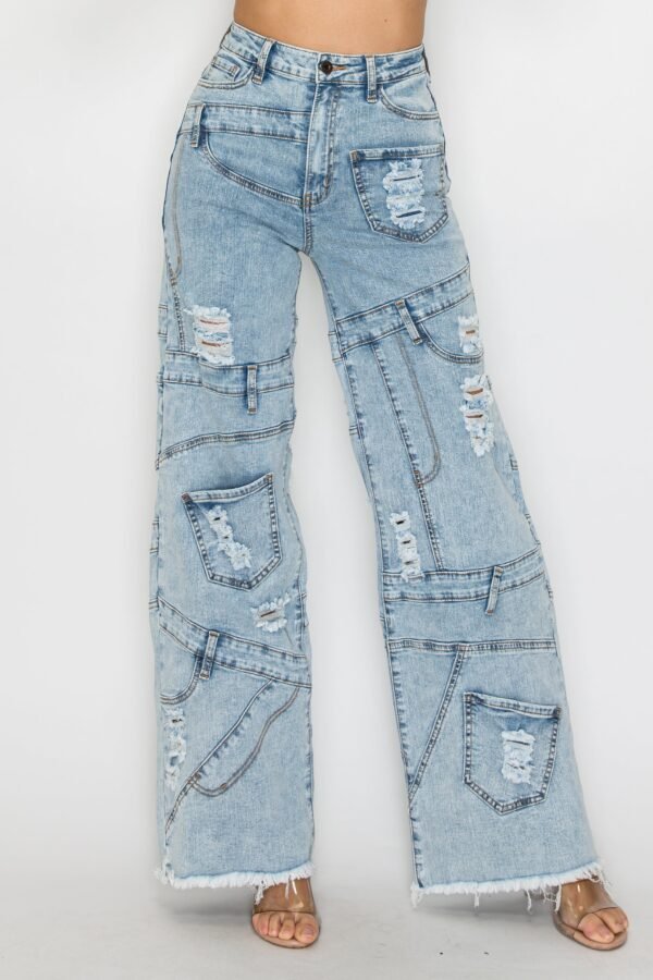 High Rise Wide Leg Mixed Panel Jeans W/ Frayed Leg Opening