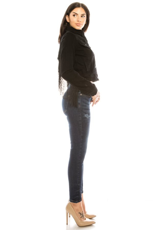 DESIGN – Fitted. cropped. button down closure. chest and side pockets with tassel at arms and back.